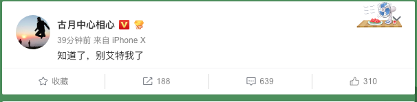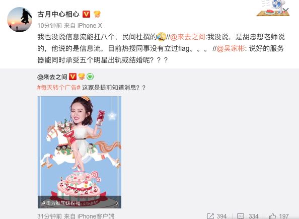 胡忠想也是 Flag 先锋人士,2017 年初他刚刚改造完微博架构,立了个 Flag,说终于不怕明星出轨了,结果没多久鹿晗咔就恋爱了,于是微博挂掉半小时。阿忠伯不服气,吭哧吭哧研发了好几个月核武器之后,他喘了口粗气在微博上说,现在可以支持八位明星并发出轨啦。终于微博不再挂了,毕竟八位明星出轨还是挺罕见的。古月因此载入微博史册。