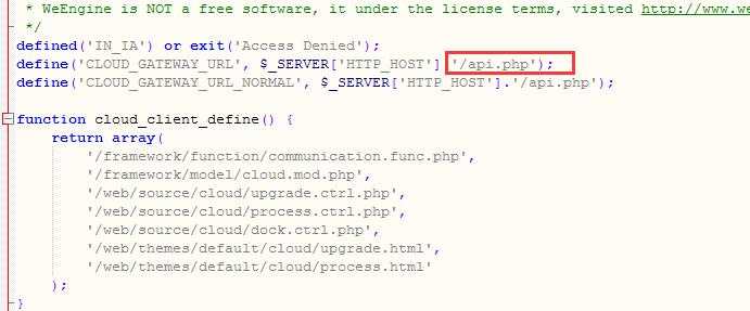1、将原有cloud.mod.php文件下载至本地,将其中的we7.cloud.cmhtml.com全部删除;