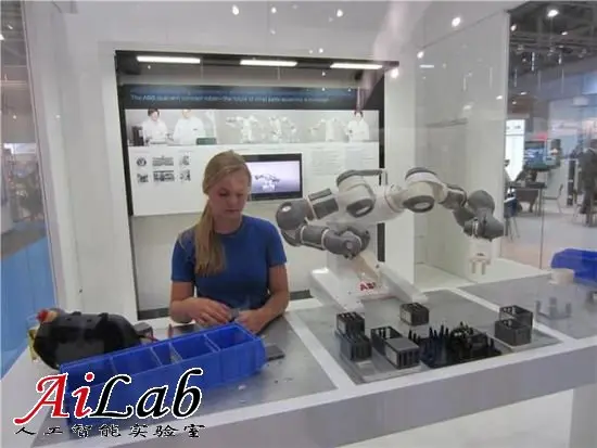 如今,这一格局即将改变,人机协作型机器人开始出现。在11月上海举行的国际工博会上,ABB展示了全球首台真正实现人机协作的机器人YuMi。作为一款人性化设计的双臂机器人,YuMi将小件装配等自动化应用带入一个全新时代。工人和机器人可以和谐共处,共同完成同一个任务。YuMi在英文中是“你和我”协同工作的简称。