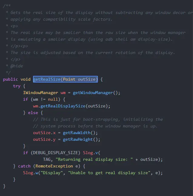 其实getRealSize这个方法在Android Api15的时候就已经加入了,不过是被隐藏了,通过查阅源码我们可以看到。