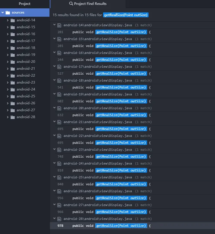 Android Api15 Display.java源码中getRealSize()方法被标记为@hide