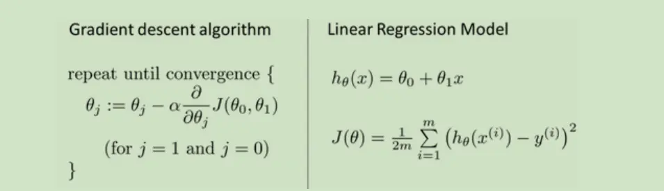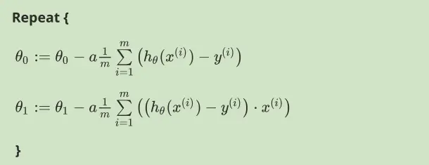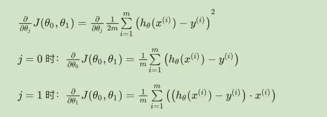 在批量梯度下降中,我们每一次都同时让所有的参数减去学习速率乘以代价函数的导数。我们要更新θ0和θ1