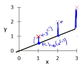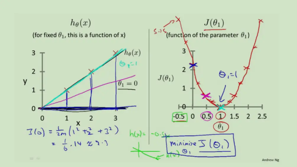 左图是θ1=0,θ1=1(也就是斜率是45和90)的值。发现θ=1时蓝色部分的差距最小趋近于0,也就是最拟合。
