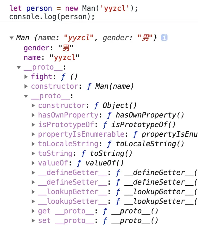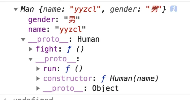 这下真的有 name 这个属性了,接下来就要考虑 Huamn 的方法了。其实这里就是要实现一个效果,就是将 person -> Man.prototype -> Object.prototype 变成 person -> Man.prototype -> Human.prototype -> Object.prototype,将 Human 的方法给插进去,要实现这一步,也就是将 Man.prototype.__proto__ = Human.prototype。看代码