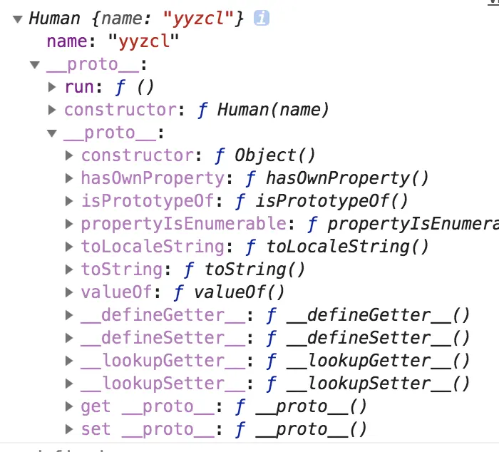 可以看到这个 person 对象拥有 Human 的属性和方法,还拥有了 Object 的属性和方法,这是因为所有的对象都源自 Object,自动发生了继承。
