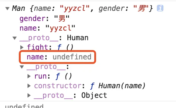 我们可以发现第3步帮我们操作了 __proto__ ,那么这么写Man.prototype = new Human()不就完成了 Man.prototype.__proto__ = Human.prototype 这个操作吗,但是有个问题,就是第4步,它执行了一遍 Human.call(this) 这下就可能出问题了。我们来试一试,看会产生什么影响。