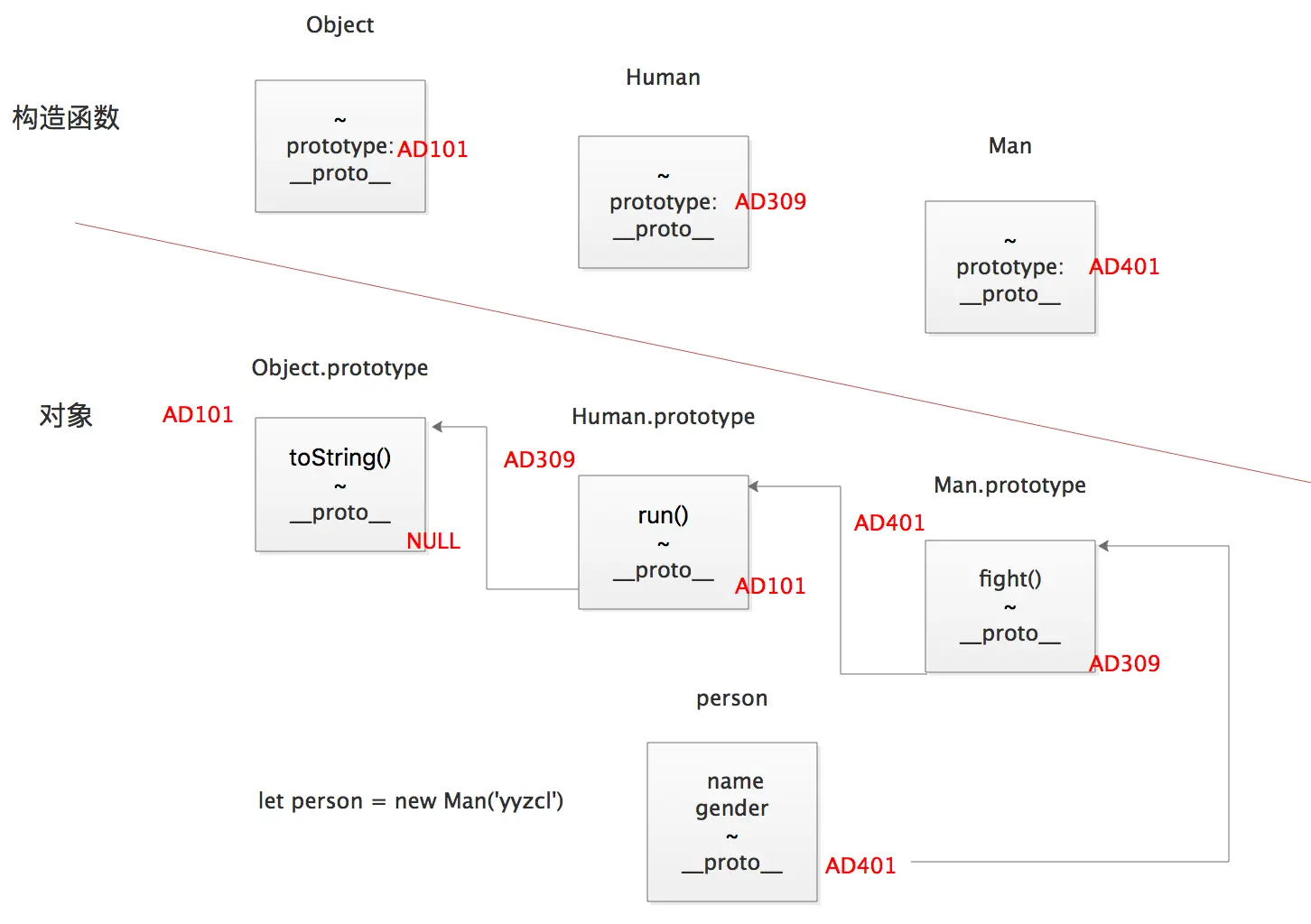 从图中可以看到,当利用 Man 构造出来一个对象 person 时,这个对象本身拥有 name 和 gender 属性,同时它的 __proto__ 指向 Man.prototype,Man.prototype.__proto__ 指向 Human.prototype,Human.prototype.__proto__ 指向 Object.prototype,这样 person 除了拥有本身的属性和方法之外,还拥有 Man、Human 和 Object 的属性和方法,完成了所谓的继承。