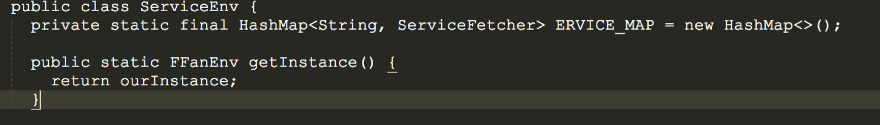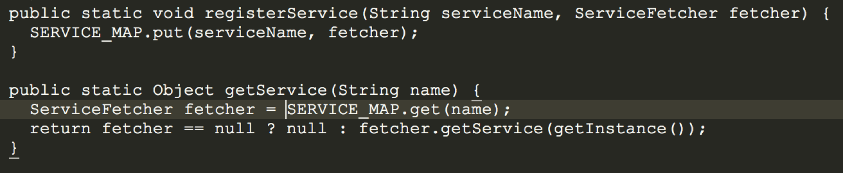 每个业务模块以service的方式暴露自己的功能和接口给到中间服务层(位于业务层之下),服务层收集各个业务暴露的方法和接口,在应用启动时(或适当的时机)注册,其他业务模块向服务层获取各个模块暴露的服务, 如图中红色部分。 服务层维护一个HashMap存放虽有的服务,如下: