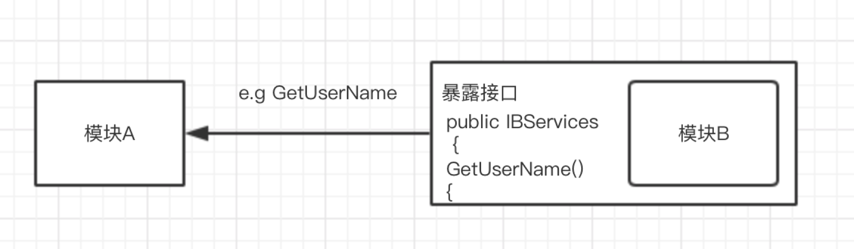 - call(模块间函数调用):每个独立的业务模块暴露Service接口,供外界调用,如:
