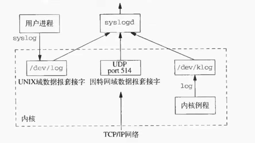 - 在此主机上的用户进程,或通过网络连接的其他主机的用户进程可将日志消息发至UDP端口514
