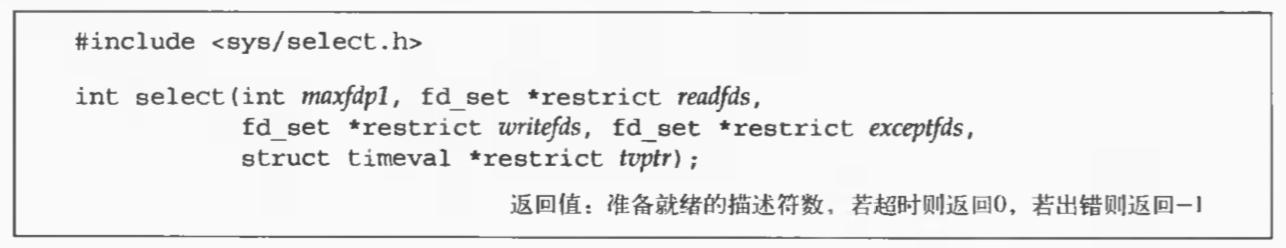 - 先构造一张有关描述符的图表,然后调用一个函数,直到这些描述符中至少一个准备好io时,该函数才返回。返回时,告诉哪些文件描述符已准备好可以io