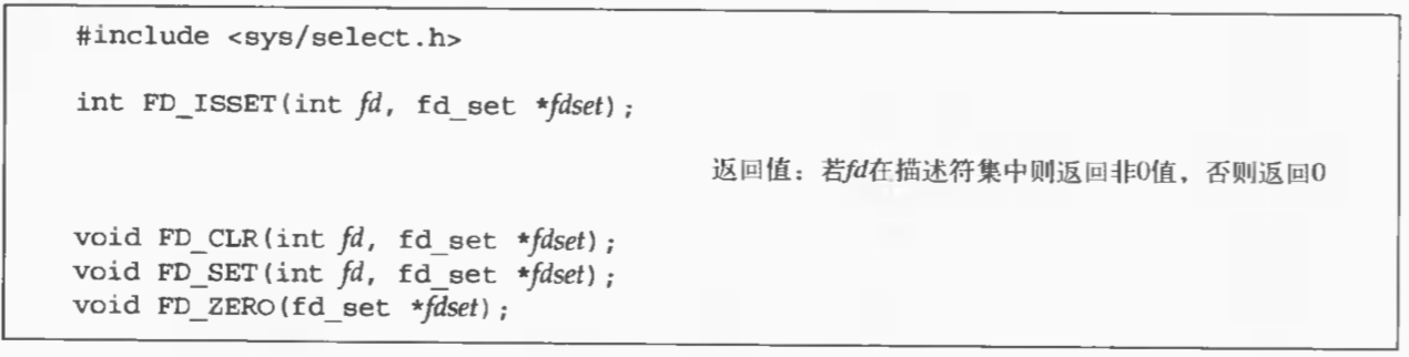 - maxfdp1:最大描述符+1,可设置为FD_SETSIZE(1024)