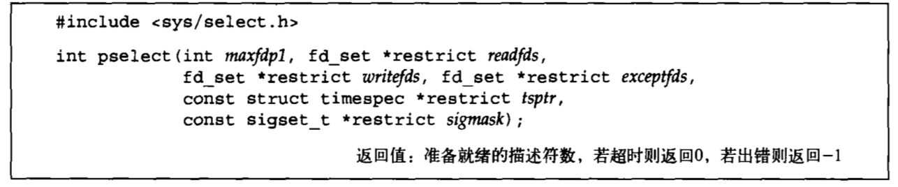 - 返回-1:表示出错,文件描述符没有准备好时收到信号,此时不修改文件描述符