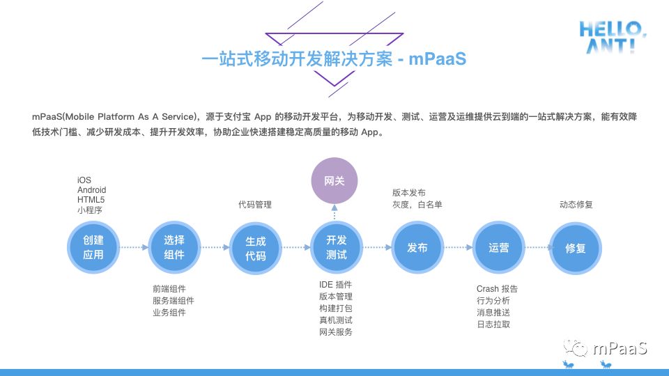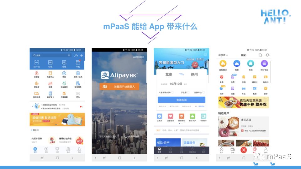 最后,支付宝所有在移动端开发方面的技术积累和架构实践,已经作为蚂蚁金服金融科技的一部分对外开放,即我们今天见到的蚂蚁金服 mPaaS。mPaaS(Mobile Platform As A Service),源于支付宝 App 的移动开发平台,为移动开发、测试、运营及运维提供云到端的一站式解决方案,能有效降低技术门槛、减少研发成本、提升开发效率,协助企业快速搭建稳定高质量的移动 App。