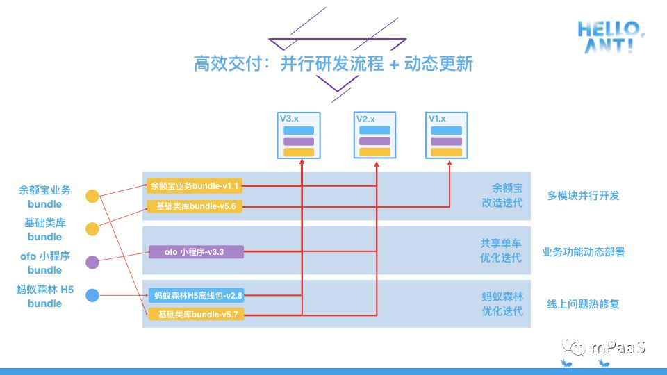 比如这张框架图,余额宝业务、ofo 小程序、蚂蚁森林、网络库等可以同时开发测试完成之后进入某一个大版本发布即可,如果存在依赖关系,只需要找和自己相关同学一起进发布,正因为如此支付宝做到了每天都有很多业务进基线,每天都在同时迭代业务。