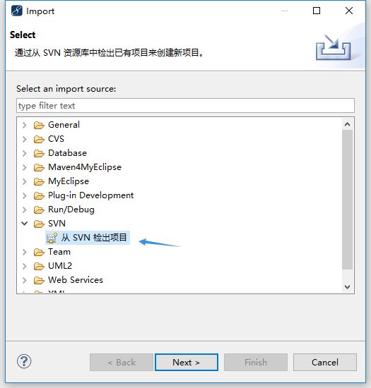 文件 -> 导入 -> 从SVN检出项目