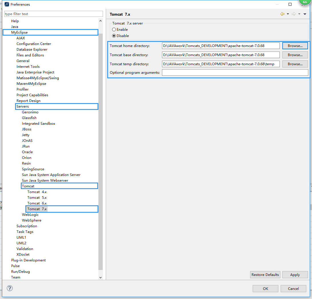 - 先去下载一个tomcat,解压放好,然后回到MyEclipse里
