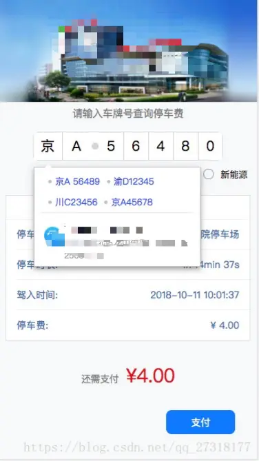 该界面为用户输入自己车牌号后点击支付就可进行微信支付
