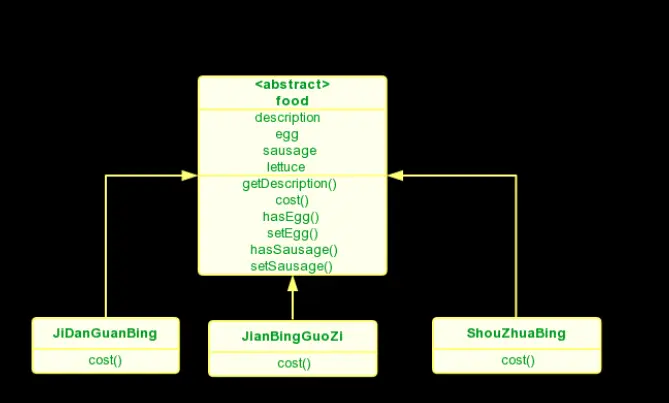 从上图可以看到基本和第一种方案基本类似,只是将配料的种类在父类中体现,以boolean类型修饰是否添加某种配料。如果顾客需要在饼中加入鸡蛋,只需要调用setEgg()方法,egg为true,使用hasEgg()方法判断是否有某种调料,但是就像图中所示,如果增加配料种类,则需要修改父类方法,并且无法添加双份配料。