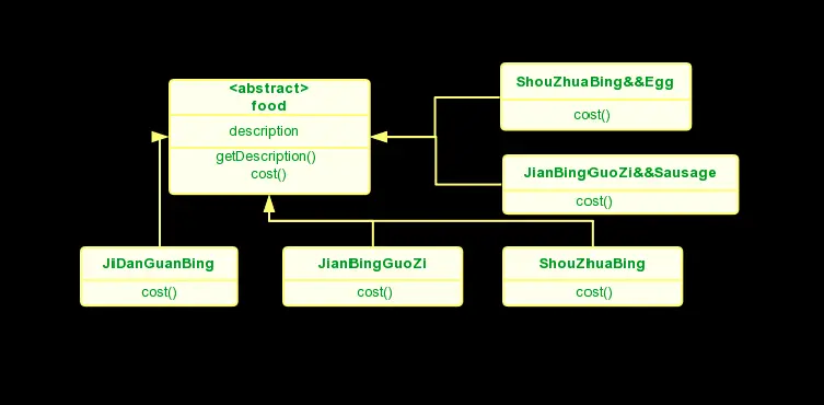 各个配料类需要继承自Decorator装饰这类,然后在构造函数中带入food类作为参数,传入父类,并需要设置其价格及其描述