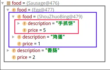 ①行new了手抓饼这个对象,然后根据Decorator的属性可以知道,配料中包含有food这个属性,因此②中的鸡蛋实例包含了手抓饼这个food实例,接着③行将鸡蛋+手抓饼作为一个food实例,共同作为香肠的一个属性,继续封装香肠对象,因此最后的food对象包含以下信息:
