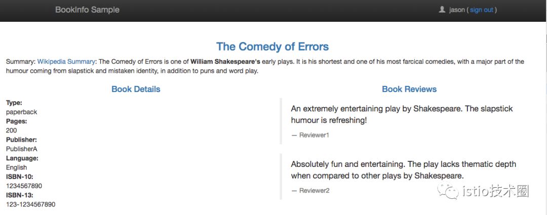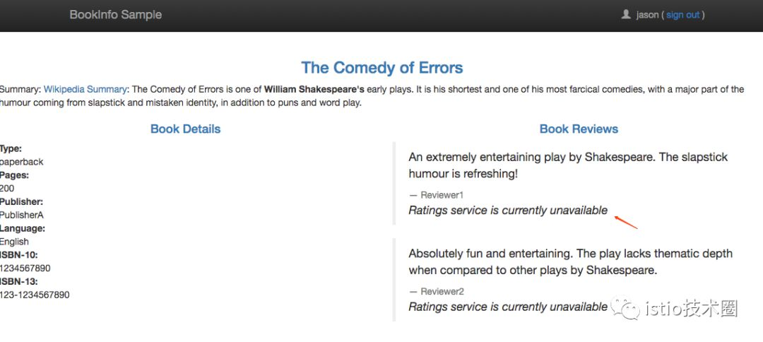 现在我们回到 BookInfo 应用,登录 jason,刷新页面,可以看到下面的现象: