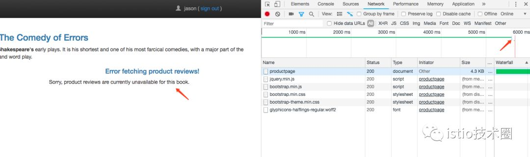创建完成后,前往 Bookinfo 应用,登录 jason,打开浏览器的Network,刷新页面,发现请求加载很慢,大约 6s 后,出现如下界面: