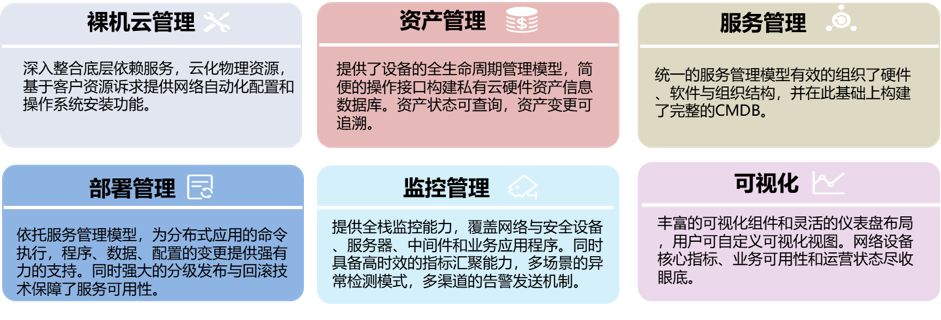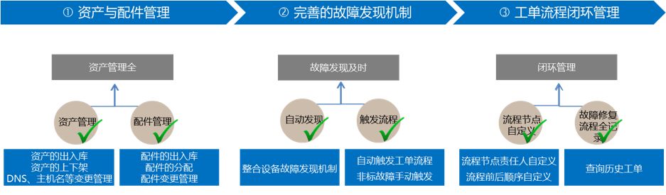 对于故障处理与修复,NoahEE通过故障自动发现与工单流程解决了上面的问题。系统自动探测故障放入故障池,并建立故障工单,由相应的人员进行操作。另外,NoahEE提供了不同的工单流程覆盖了日常机房运维中的操作,从设备采购入库、上架、机架变更,直到设备下架、出库全生命周期覆盖,做到所有运维操作记录可追溯。有了资产管理,运维人员可以在服务器完成入库、上架工单后即可在服务管理中看到该服务器并进行管理,无须任何其他操作。一图胜千言,我们看看资产管理的特点: