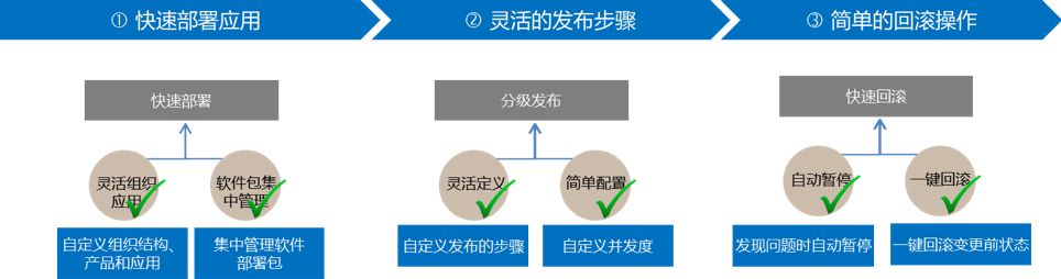 上面的第一个问题,实际上在服务管理中已经解决了,也就是说服务管理帮我们完成了资源定位工作。其他的问题,NoahEE的部署管理模块通过“分级发布 ”来解决。在部署管理模块中,我们可以方便的定义并发度、部署步骤、影响范围以及暂停操作等,在部署的过程中发现问题即可暂停并回滚至之前的状态。除了部署等操作,部署管理模块还提供了批量执行命令等操作(比如批量启停某一服务)。如图来总结部署系统的能力: