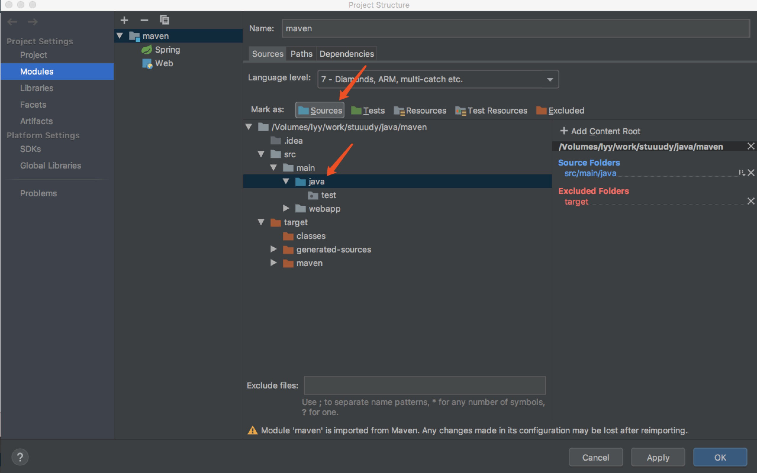 File->Project Structure->Modules-Sources