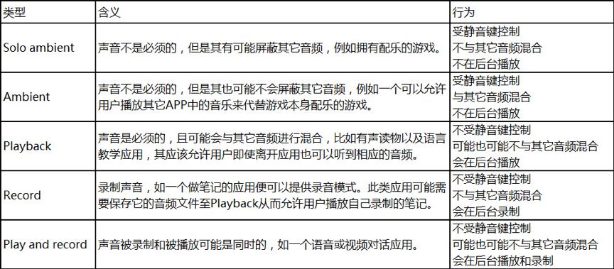 不同的音频类别允许声音被静音按钮静音、与其它声音混响、或是当你的应用在后台时播放。根据类别的含义和当前设备的音频播放情况来选择一个类别,然后将其分配给你音频对话(audiosessions)。比如:非必要情况下,请不要打断用户正在收听的来自其它应用的音乐。