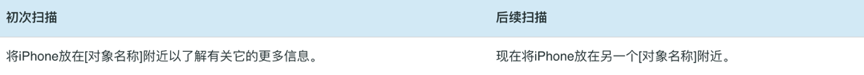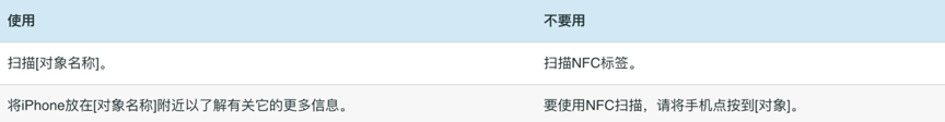 不要鼓励人们接触物体,要扫描标签,iOS设备必须非常靠近标签,它不需要实际触摸标签。当要求人们扫描物体时,使用扫描和保持附近等术语而不是点击和触摸。