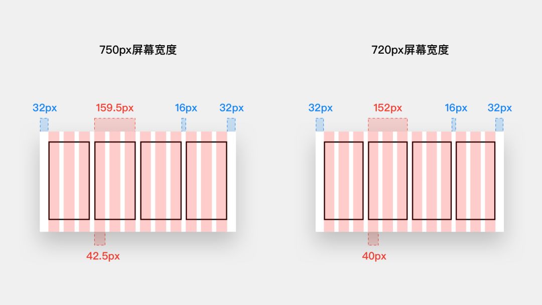 例如下图的尺寸中,代表外边距和水槽的蓝色数值,是我们需要提供给研发的固定值,而红色的数值是根据屏幕实际宽度计算得来的。因此我们只需要保证提供给研发的数值遵循网格系统规律即可,至于页面中计算得来的数值,那0.5px的偏差肉眼是感觉不出来的。