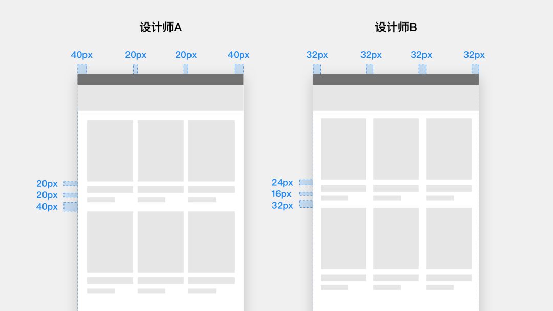 当多名设计师共同设计一款APP的时候,一个经过深思熟虑的网格系统就变得尤为重要。每个设计师都有一套自己的设计方法和习惯,如果没有一个统一的框架去约束的话,有可能在设计类似的组件或页面时,不同设计师会给出不同的设计解法,这样的话整个APP内的页面都会比较混乱。例如下图,设计师A和B都各自遵循一套尺寸规范去搭建页面,但是设计结果给人的感觉却完全不一样。