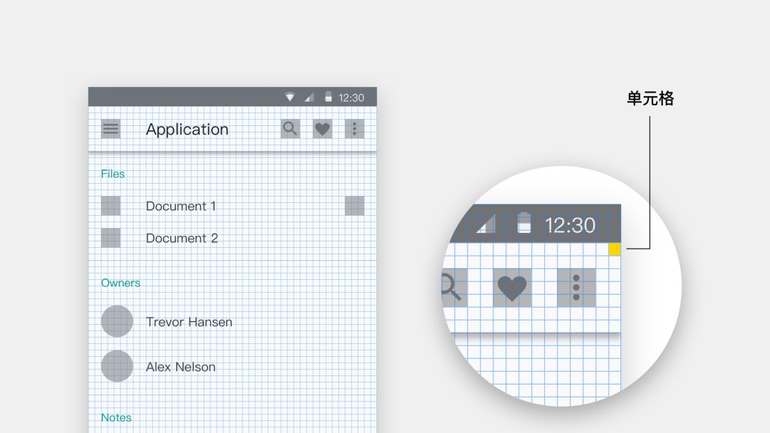 前面我们介绍了网格系统是由水平和垂直的线,将页面划分成一个个细小的正方形格子,那么这个正方形的格子,就是网格系统里面最基本的元素“单元格”,即图中黄颜色的区域。作为接受过九年义务教育的好青年,想必大家在中学的时候都接触过化学的基础知识,物质的最小单位是原子,原子组成分子,分子组成有机物……我们可以把这个单元格看做是一个原子,那么图标、按钮就是分子,整个页面就是由无数原子组成的有机物。