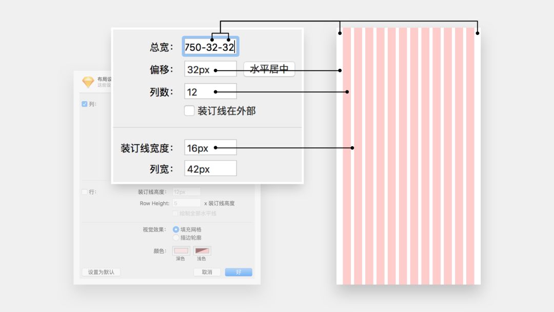 利用sketch的布局设置功能,即可快速搭建出网格系统的参考布局,在平时做设计的过程中,可以经常使用Ctrl+L快捷键切换布局的显示,提高设计效率。(另外有几点需要注意:1、总宽=屏幕总宽度-外边距x2;2、偏移=外边距;3、“装订线在外部”不要勾选。)