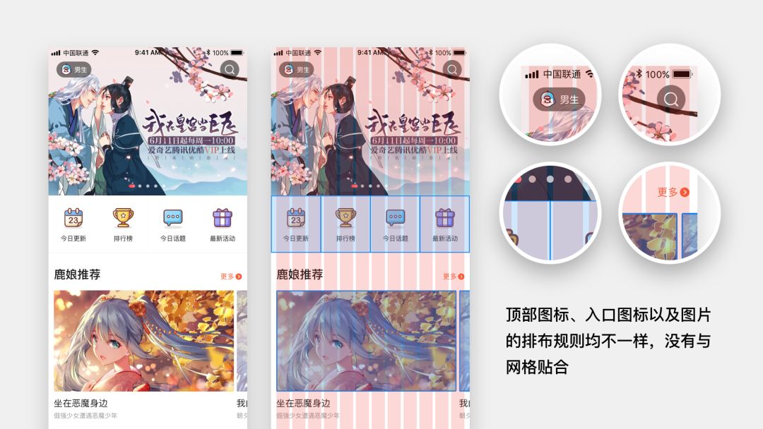 并不是每个元素都必须要与网格对齐的,要根据自己的实际需要而定,如果硬套进去的话,页面就会显得很怪异 。图中左面的页面的 三个tab标题想要在网格上与封面对齐,但是标题之间距离太大,看起来很不舒服。这里三个tab标题的间距是固定值,不需要根据屏幕宽度去适配,因此要把三个tab标题看做是一个整体,即一个tab组件,组件左端与网格贴合即可。