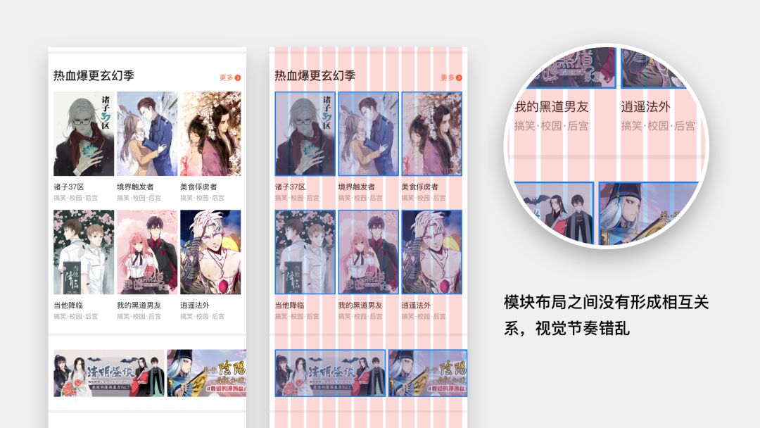 现在我们开始统一使用8px、12列网格系统,对首页进行一次布局优化。在下面三张图中我们看到,无论是顶部图标、入口图标、竖版封面还是横版封面,都由网格系统整体串联起来了,不再是凌乱独立的个体,阅读起来更顺畅。横向的间距也都开始使用8px的整数倍,给用户带来更有节奏的浏览体验。