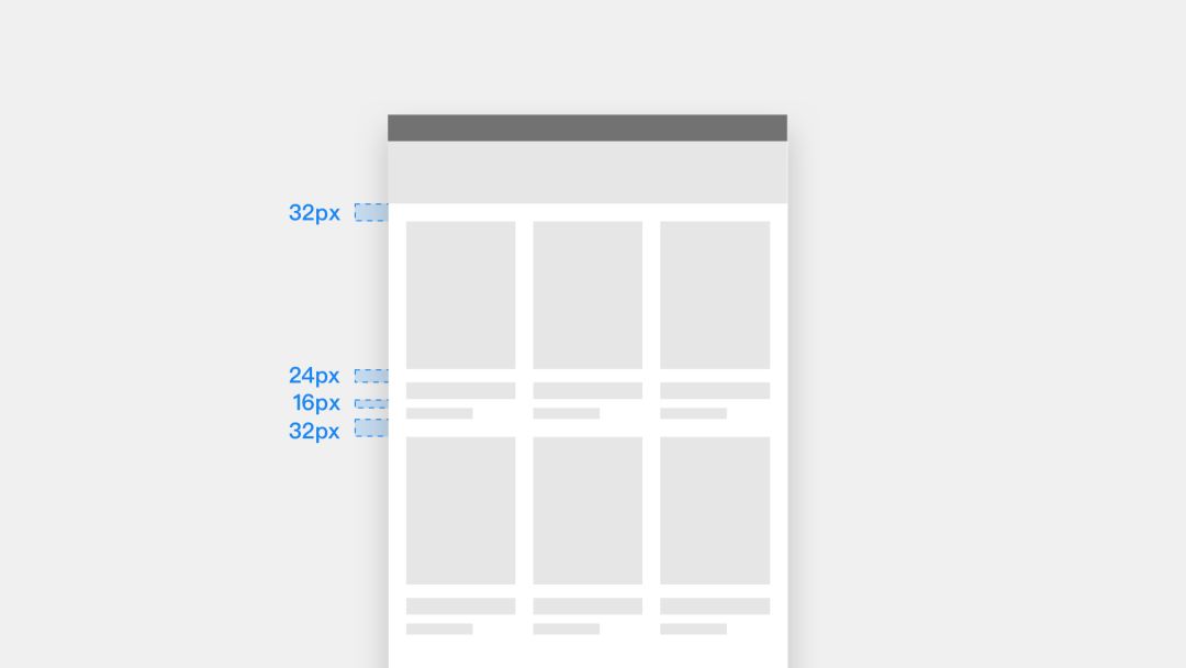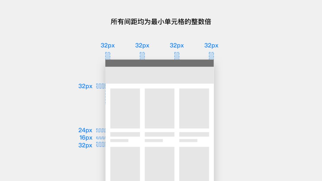 既然确定了最小单元格的数值,那么页面里所有的间距(包括水槽、外边距、横向间距等)、组件尺寸等都需要是最小单位的整数倍,以达到统一视觉节奏的目的。例如单元格选择为8px,那么所有用到的间距尺寸将会是8px、16px、24px、32px、40px……