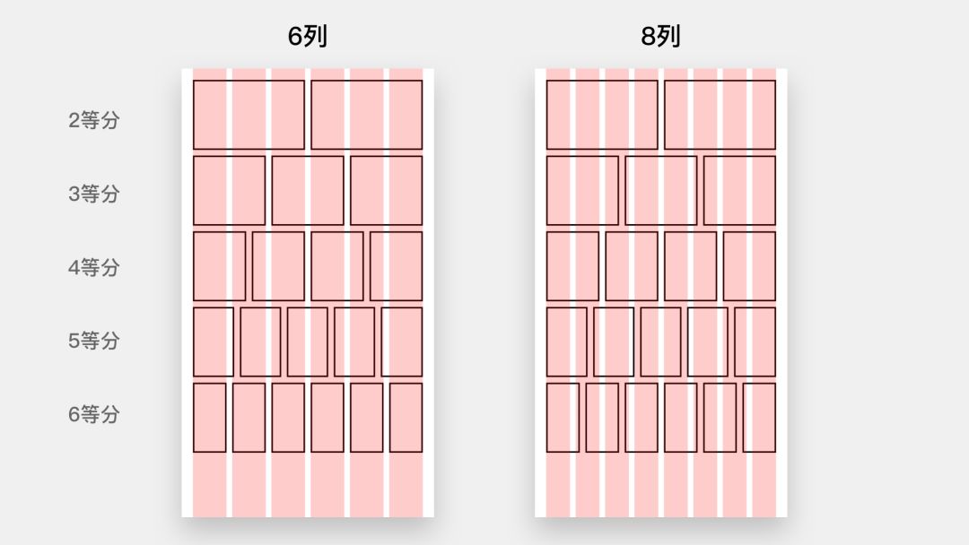 以下列举了几种典型情况(4列、10列、16列等大家有兴趣的话可以自己尝试一下,这里就不一一列举了),我们发现12列和24列除了5等分外,其他情况都可以满足,6列相对稍微差了一点,即结果为:12列=24列>6列>8列。不过其中24列显然将有限的手机屏幕分割的太碎了,因此在实际使用中还是以12列和6列为主。