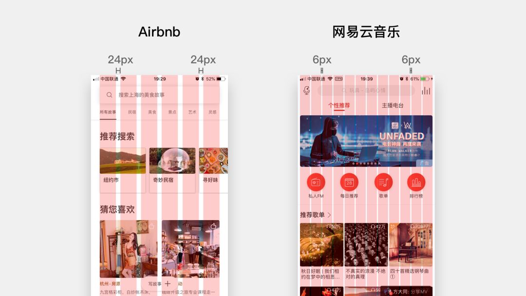 外边距数值越大,页面显得越宽松,数值越小越显得比较“满”,因此需要根据自己实际的情况去确定具体数值。例如Airbnb的产品调性就是简约大气,整体布局比较宽松,因此在外边距的数值上选择的是48px。再例如网易云音乐,页面中以专辑、歌单等的封面为主,侧重于表现图片的视觉冲击力,因此页面内容区域比例会比较大,外边距的数值选择了12px。