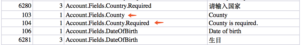 4、先把所有数据导到Excel中,然后根据字段名字排序,一般而言,如果中英文都有的话,应该是下面这样两两一组排列在一起的: