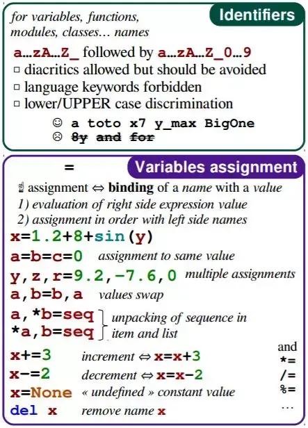 标识符:用于代表变量、函数、模块、类等的名称。注意尽量避免使用读音符号,不要使用 Python3 中的关键字,Python3 的标识符是区分大小写的,框图中分别列出了允许和不允许的标识符示例。