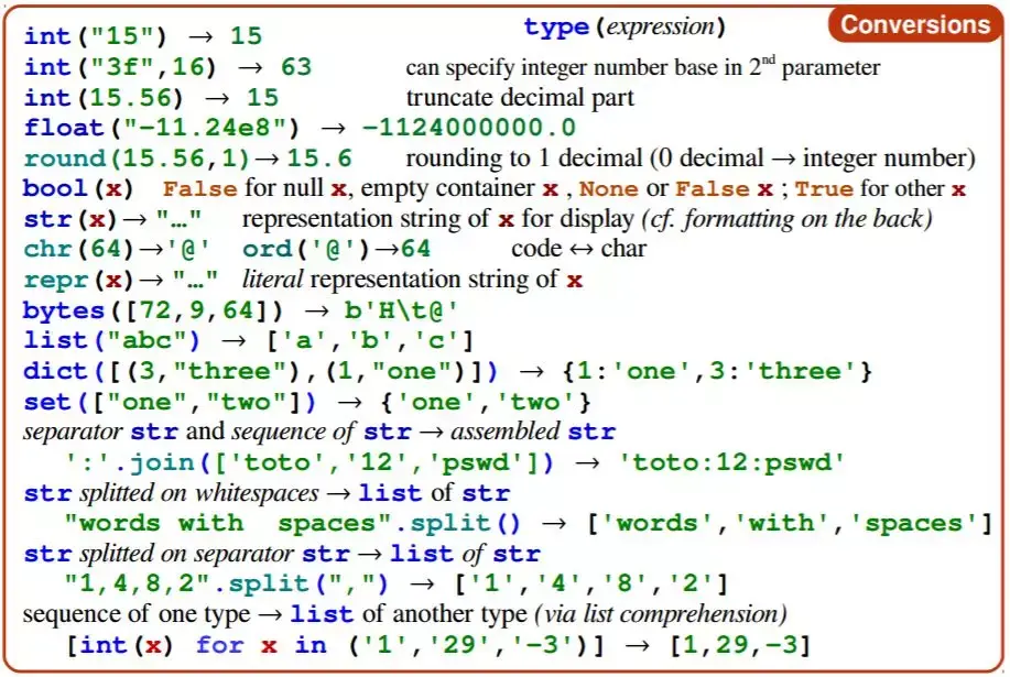 类型转换:将数据从某一个数据类型转换为另一个数据类型,或将某一个数据结构转换为另一个数据结构。可以将表达式总结为 type(expression),其中 type 是目标转换类型,expression 是要转换的数据或数据结构。此外,也可以用更具体的句式转换列表的格式,或者对列表中的每个数据同时转换数据类型。