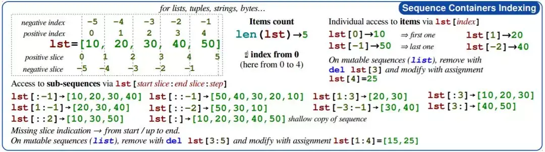 序列容器索引:用于列表、元组、字符串、bytes 的数据排序。可以使用正索引,也可以使用负索引。定义了索引之后,可以方便地对容器的数据进行访问、赋值(可变量)等操作,数据访问/赋值可以用于单个数据,也可以用于多个数据,并能指定间隔、顺序/倒序等。