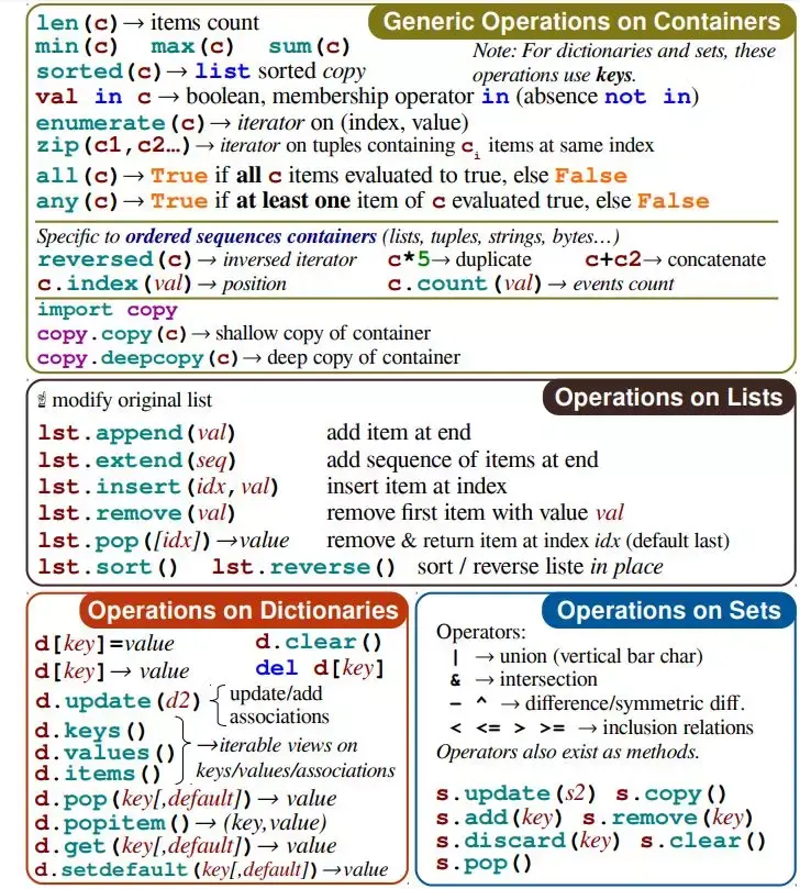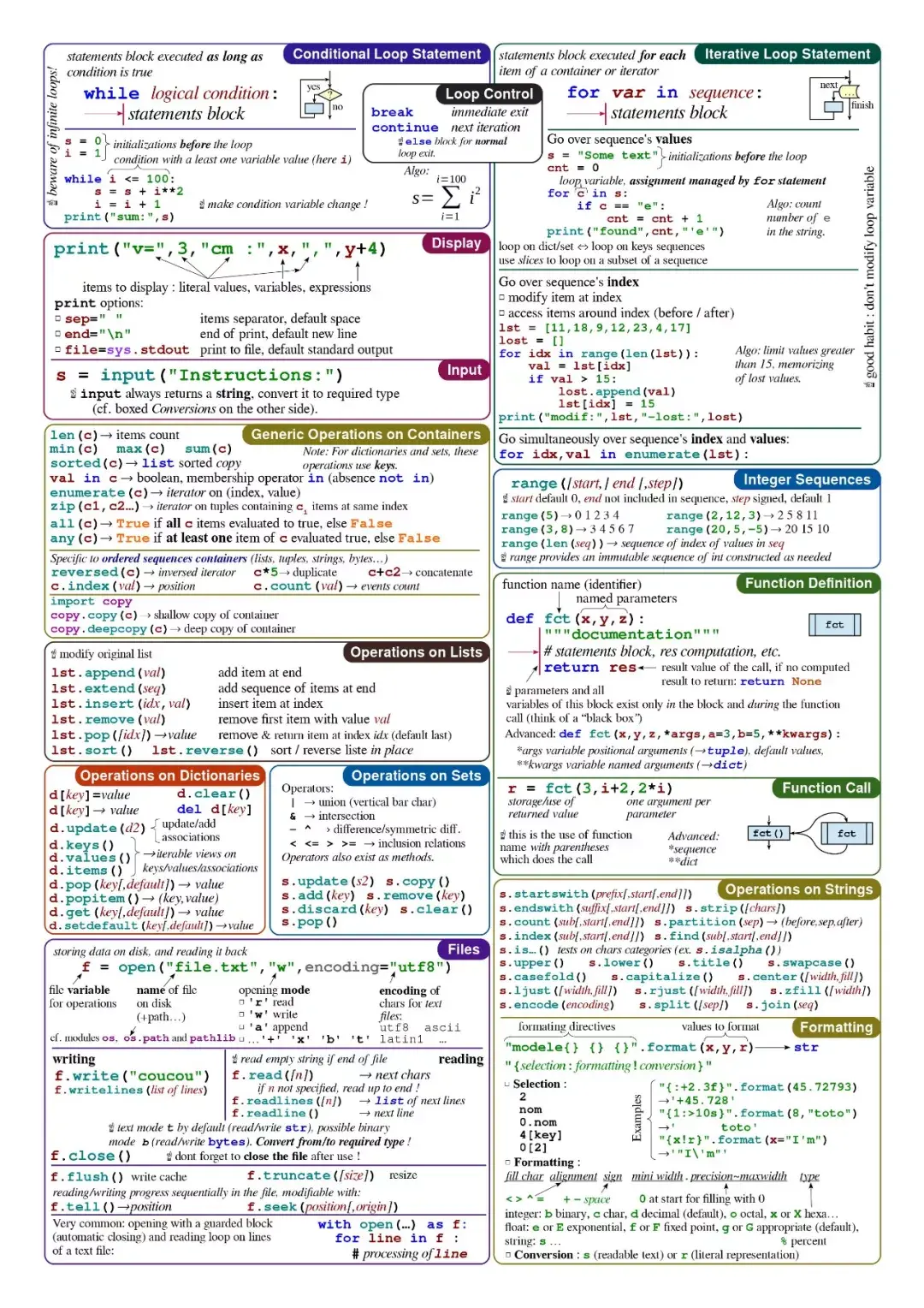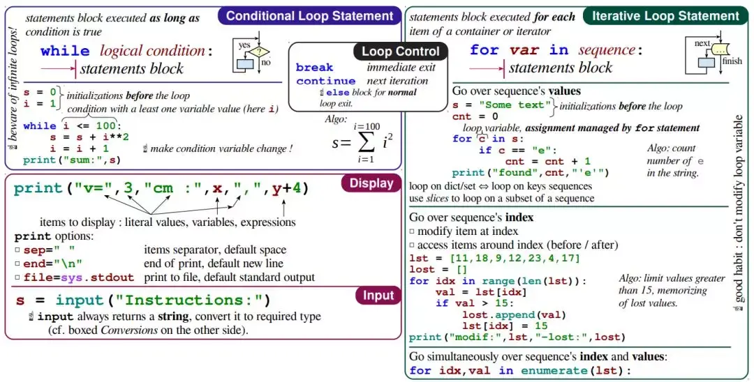 今天要介绍的 Python 3 Cheat Sheet 由法国国家科学研究中心(CNRS)的法国机械工程与信息技术实验室(LIMSI)的工程师 Laurent Pointal 总结。这个简单的 Cheat Sheet 专注于从算法/编程开始所必需的语言部分,提供了学生入门所需的一般信息。注意:它不涉及面向对象的编程。