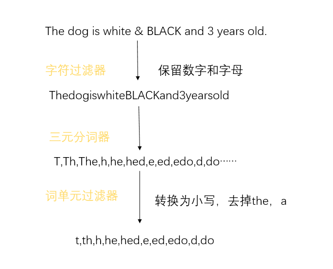 定义一个分析器trigram_analyzer,采用分词器tokenizer,采用ngram作为此单元过滤器,字符过滤器只保留字母letter 和数字digit,并转换为小写字母lowercase,去掉the 和a