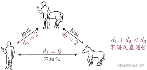 需要注意的是,通常我们是基于某种形式的距离来定义“相似度度量”(similarity measure),距离越大,相似度越小。然而,用于相似度度量的距离未必一定满足以上所有的性质,尤其是直递性(式1.4)。例如在某些任务中我们可能希望有这样的相似度度量:“人”、“马”分别与“人马”相似,但“人”与“马”很不相似;要达到这个目的,可以令“人”“马”与“人马”之间的距离很小,但“人”与“马”之间的距离很大,如下图所示,此时该距离不满足直递性;这样的距离称为“非度量距离”(non-metric distance)。