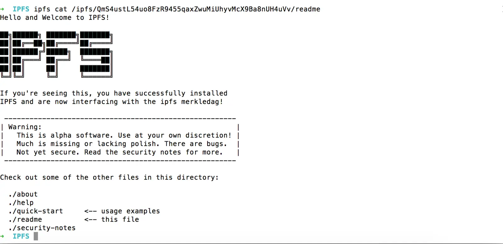 ➜ IPFS ipfs init initializing IPFS node at /Users/AdnanAhmad/.ipfsgenerating 2048-bit RSA keypair...donepeer identity: QmaJcDSAceC6nDZ4CEz8F6mkiGcATjWbCE8JAfbiVxY7oWto get started, enter:ipfs cat /ipfs/QmS4ustL54uo8FzR9455qaxZwuMiUhyvMcX9Ba8nUH4uVv/readmeAnd when you run ipfs cat /ipfs/QmS4ustL54uo8FzR9455qaxZwuMiUhyvMcX9Ba8nUH4uVv/readme on command line it should show you something like below: