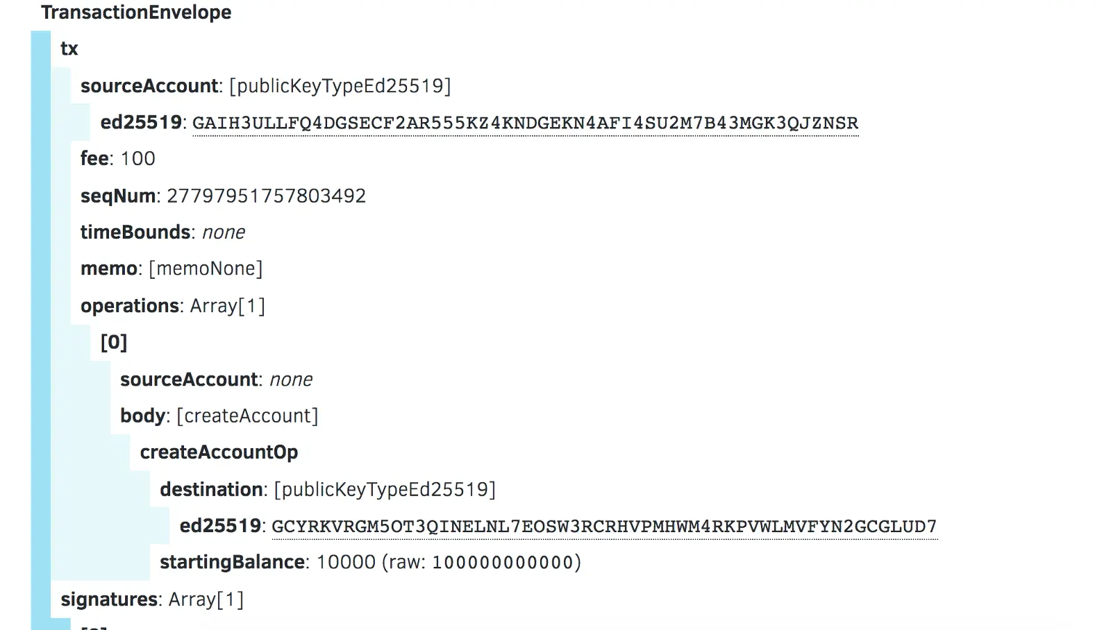 { "_links": { "transaction": { "href": "https://horizon-testnet.stellar.org/transactions/eead4d417b9f6dc735216d9041d811baf042e3631c373e325070f33384707583" } }, "hash": "eead4d417b9f6dc735216d9041d811baf042e3631c373e325070f33384707583", "ledger": 9054841, "envelope_xdr": "AAAAABB90WssODNIgi6BHveqzxTRmIpvAFRyVNM+Hm2GVuCcAAAAZABiwhcAAd/kAAAAAAAAAAAAAAABAAAAAAAAAAAAAAAAsRVWJmddPcENItq/kdK24iier2HszkVPrZbKlw3RhGUAAAAXSHboAAAAAAAAAAABhlbgnAAAAEA9LreUnmBjv42x1PqUwLn+t6N1zQKJlPxztMUCy2iqpgdhyA+oWBjx08+83dFeNPAk/duMs5ZP1DQnBgI7J+gC", "result_xdr": "AAAAAAAAAGQAAAAAAAAAAQAAAAAAAAAAAAAAAAAAAAA=", "result_meta_xdr": "AAAAAAAAAAEAAAADAAAAAACKKnkAAAAAAAAAALEVViZnXT3BDSLav5HStuIonq9h7M5FT62WypcN0YRlAAAAF0h26AAAiip5AAAAAAAAAAAAAAAAAAAAAAAAAAABAAAAAAAAAAAAAAAAAAAAAAAAAwCKKnkAAAAAAAAAABB90WssODNIgi6BHveqzxTRmIpvAFRyVNM+Hm2GVuCcAAfzKPoeba8AYsIXAAHf5AAAAAAAAAAAAAAAAAAAAAABAAAAAAAAAAAAAAAAAAAAAAAAAQCKKnkAAAAAAAAAABB90WssODNIgi6BHveqzxTRmIpvAFRyVNM+Hm2GVuCcAAfzEbGnha8AYsIXAAHf5AAAAAAAAAAAAAAAAAAAAAABAAAAAAAAAAAAAAAAAAAA"}Stellar provides a neat tool to debug every operation output, called XDR Viewer. In this case, I am going to check envelope_xdr content. Upon pasting the value of envelope_xdr it generated a unique public URL, something like that. If you check the decoded output, you will see something like given below:
